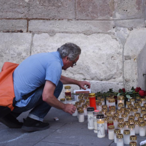 6月11日,在奥地利首都维也纳,一名男子在斯蒂芬教堂广场摆放蜡烛,悼念校园枪击案遇难者。