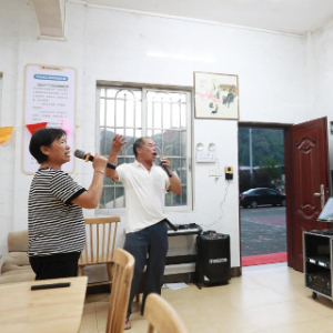 6月10日,晚饭后,仙溪村老人在长者饭堂里唱歌娱乐。