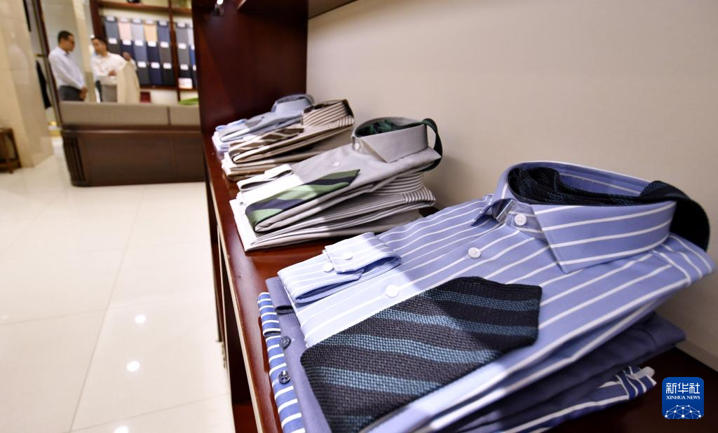 位于北京王府井商圈内的隆庆祥总店内展示的定制西装配套的定制衬衫(6月10日摄)。
