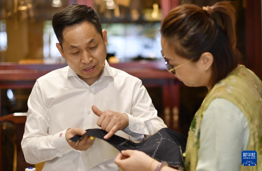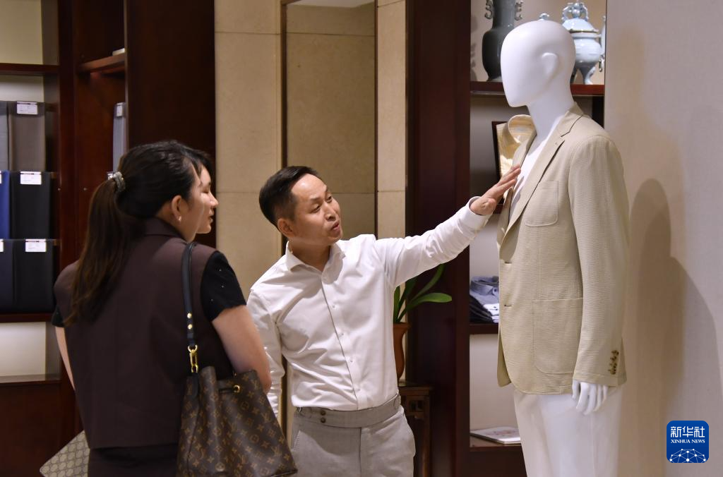 6月10日,“隆庆祥传统西装制作技艺”非遗项目代表性传承人李伟(右)在为顾客介绍服装款式。