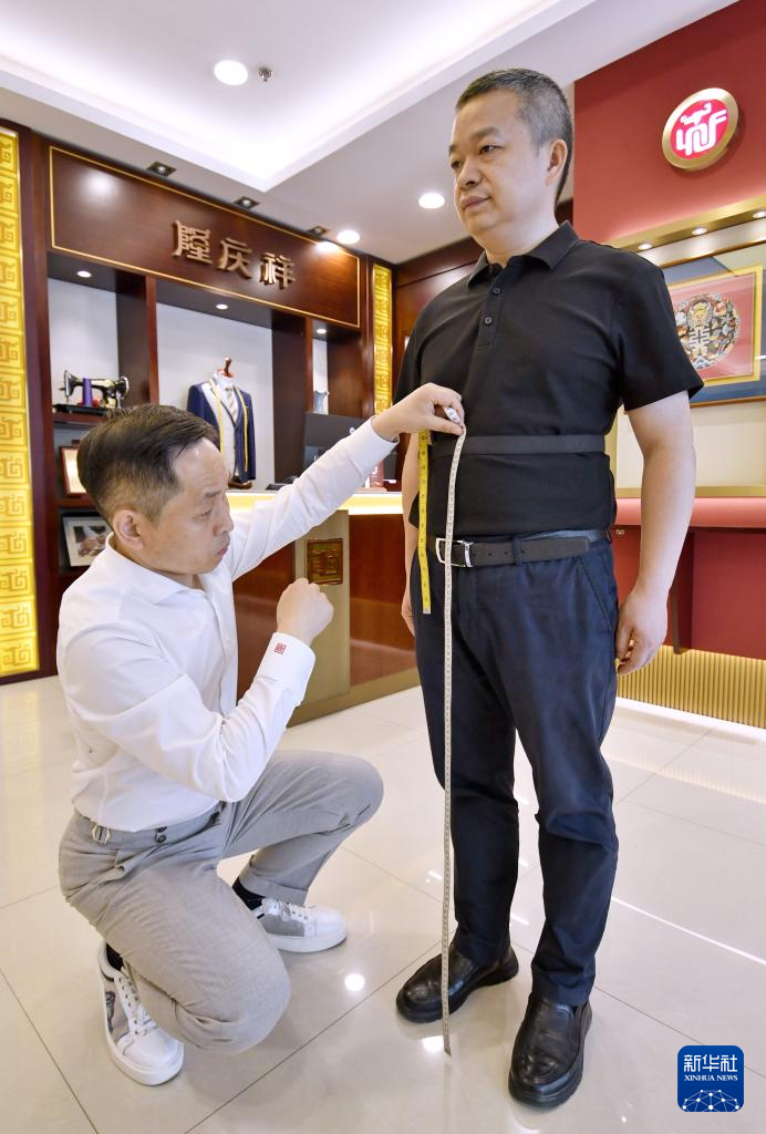 6月10日,“隆庆祥传统西装制作技艺”非遗项目代表性传承人李伟为顾客用27道量体法量体。