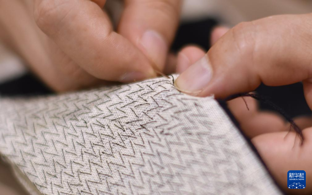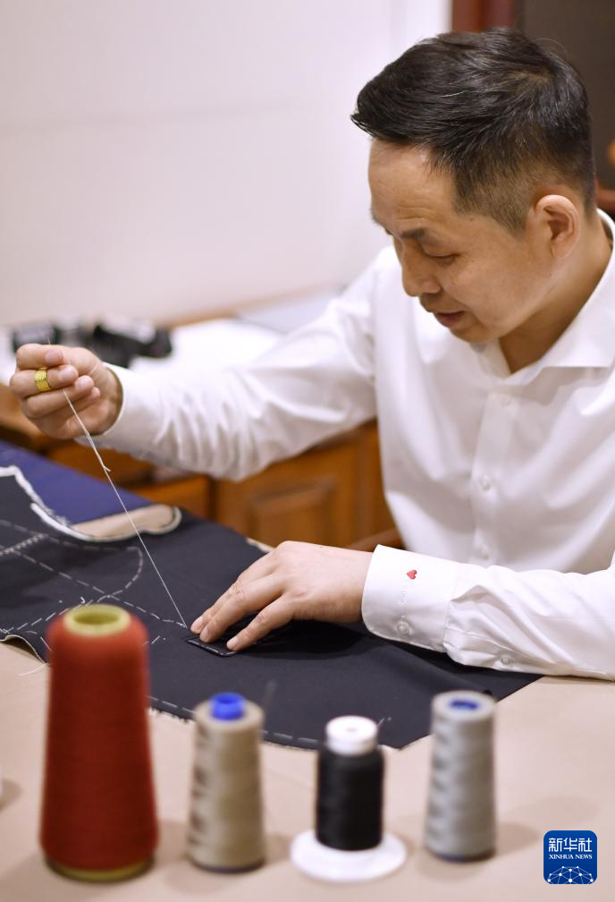 6月10日,“隆庆祥传统西装制作技艺”非遗项目代表性传承人李伟在展示传统非遗技艺手工纳驳头。