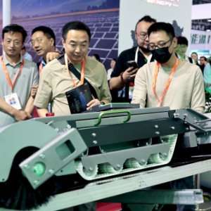 6月12日,参观者在展会现场观看全自动光伏清洁机器人进行作业演示。