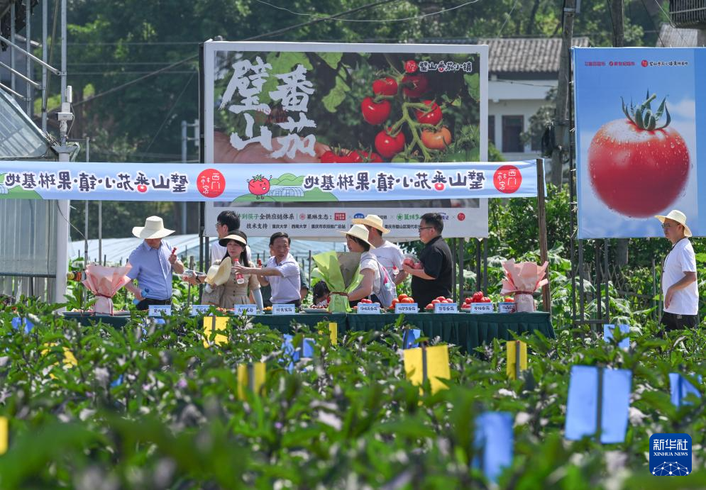 6月12日,重庆璧山番茄小镇·果琳基地,游客在田间展台品尝农产品。
