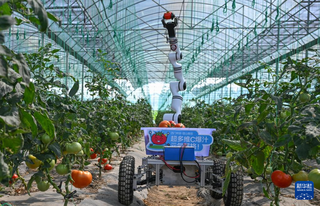 6月12日,重庆璧山番茄小镇·果琳基地内,机器人自动摘取成熟的番茄。