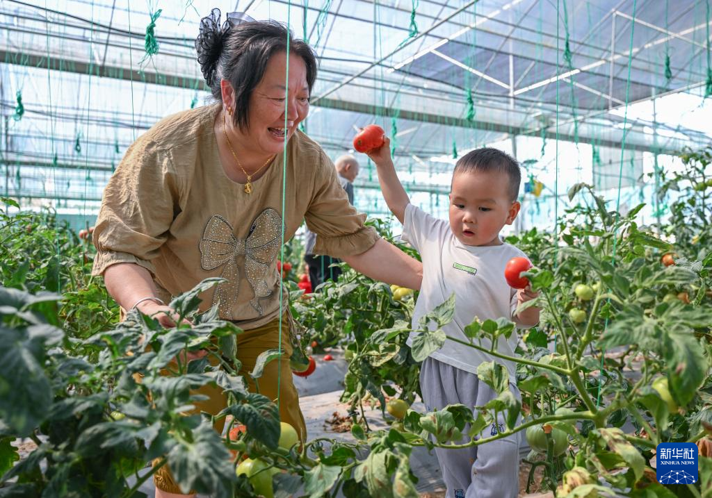 6月12日,重庆璧山番茄小镇·果琳基地内,小朋友在家长的陪同下采摘番茄。