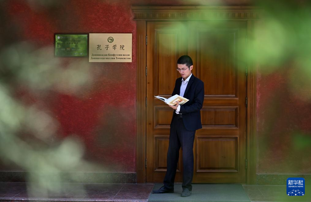 6月1日,夏冉在位于杜尚别的塔吉克斯坦民族大学孔子学院外翻阅书籍。