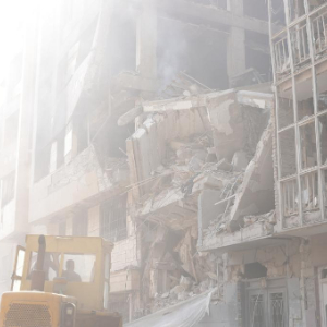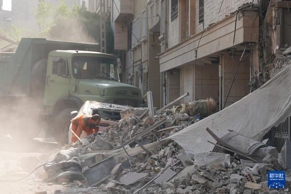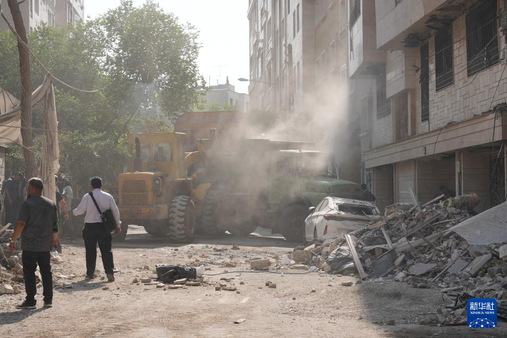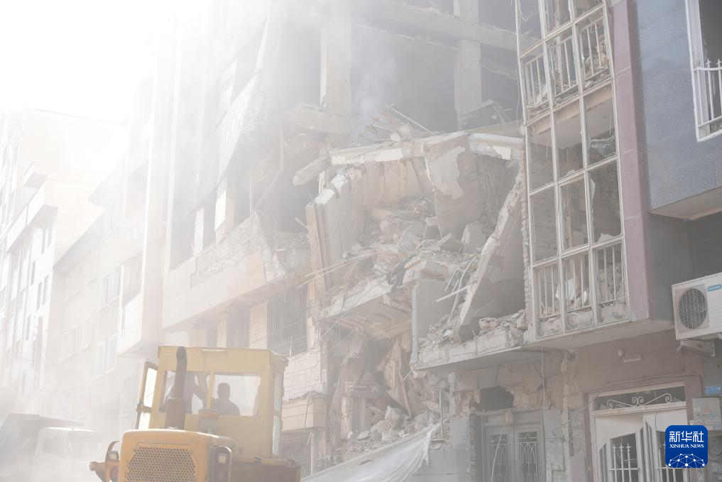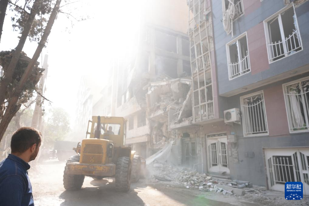 6月13日,在伊朗首都德黑兰,工程车辆清理在以军袭击中受损的建筑。