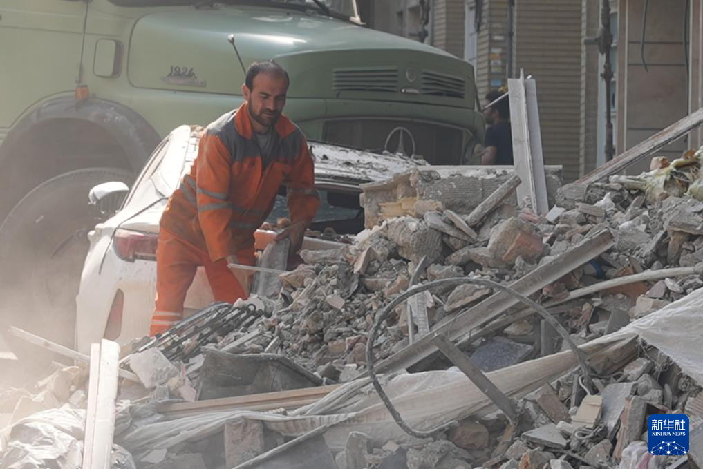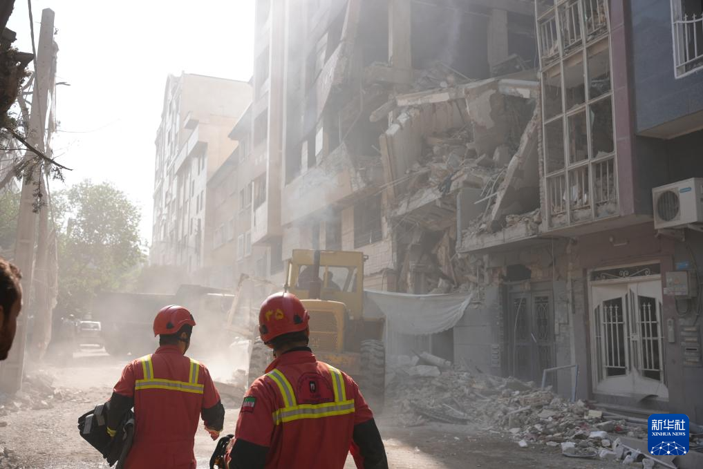 6月13日,在伊朗首都德黑兰,救援人员清理在以军袭击中受损的建筑。
