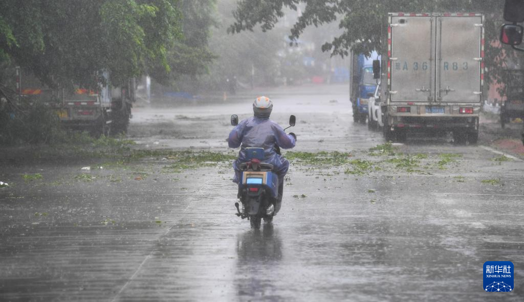 6月13日,在海南省乐东黎族自治县莺歌海镇,居民在台风中骑车出行。