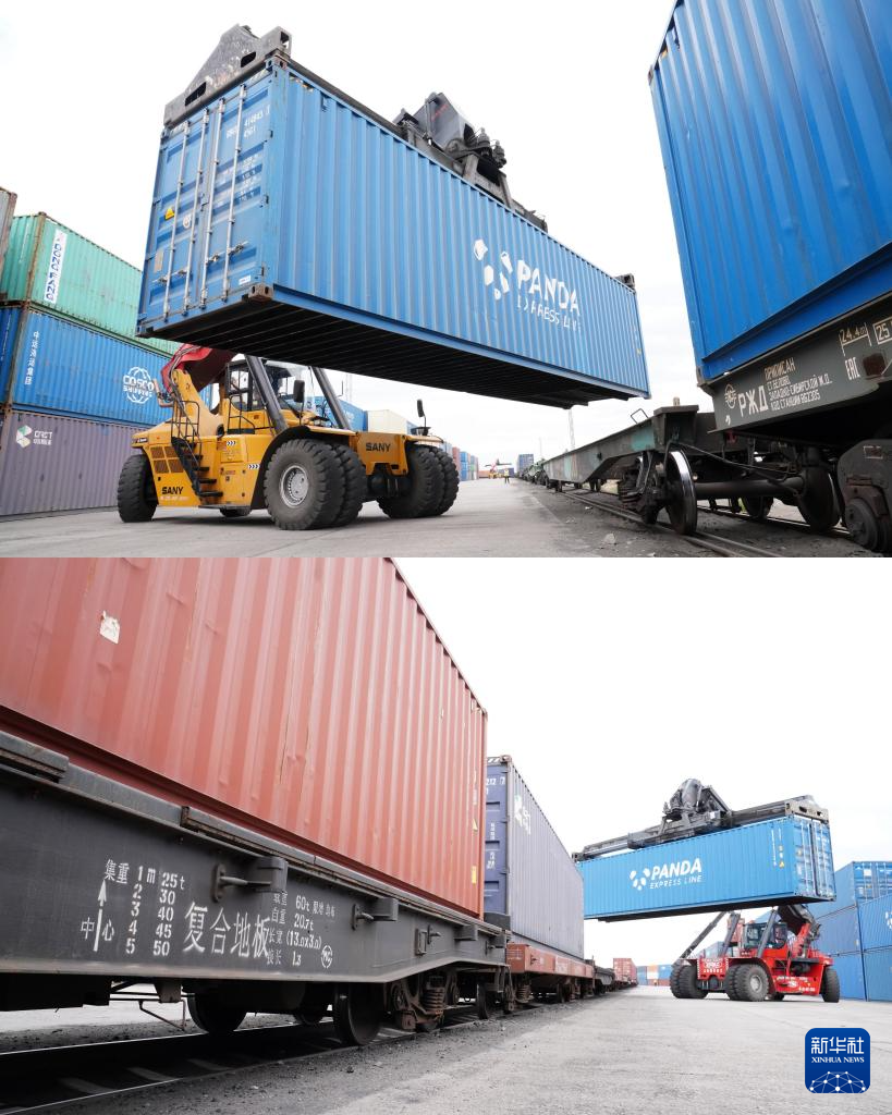这是6月14日在二连浩特口岸集装箱作业区拍摄的回程中欧班列换装现场,上图为工作人员将集装箱从外方1520毫米宽轨列车上卸下,下图为工作人员将集装箱装载到中方1435毫米标准轨列车上(拼版照片)。