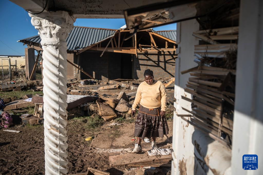 6月13日,在南非东开普省姆塔塔,一位当地居民返回在洪水中损毁的房屋。