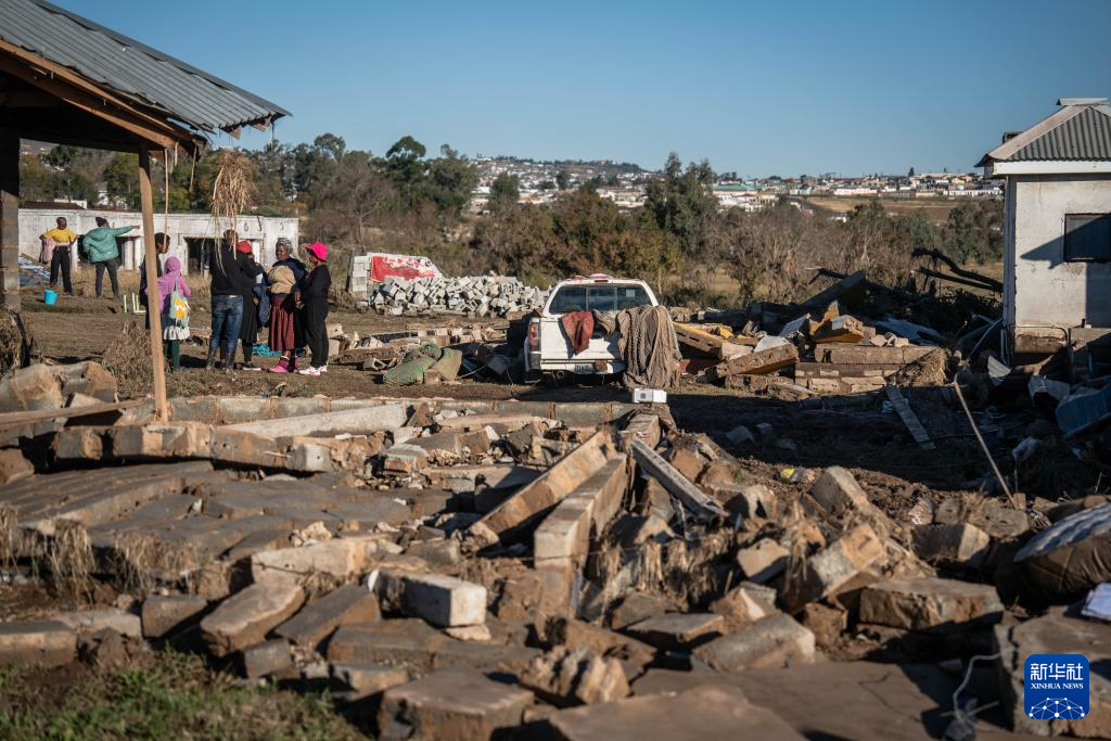 6月13日,在南非东开普省姆塔塔,人们聚集在被洪水损毁的房屋旁。