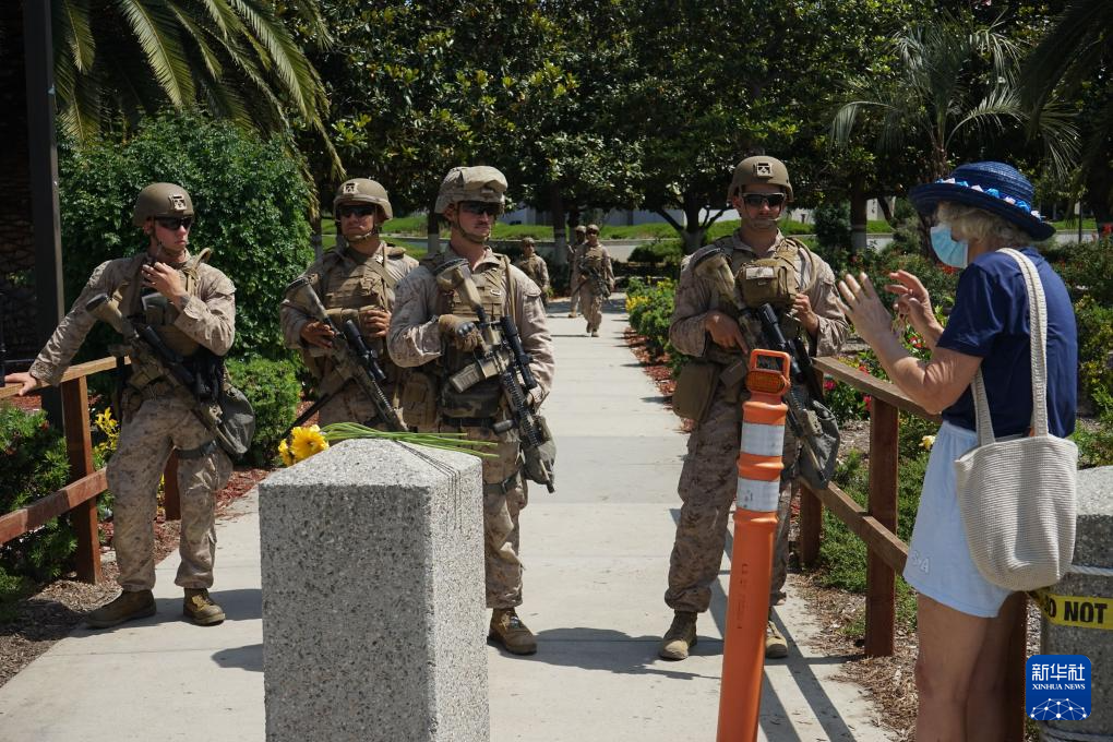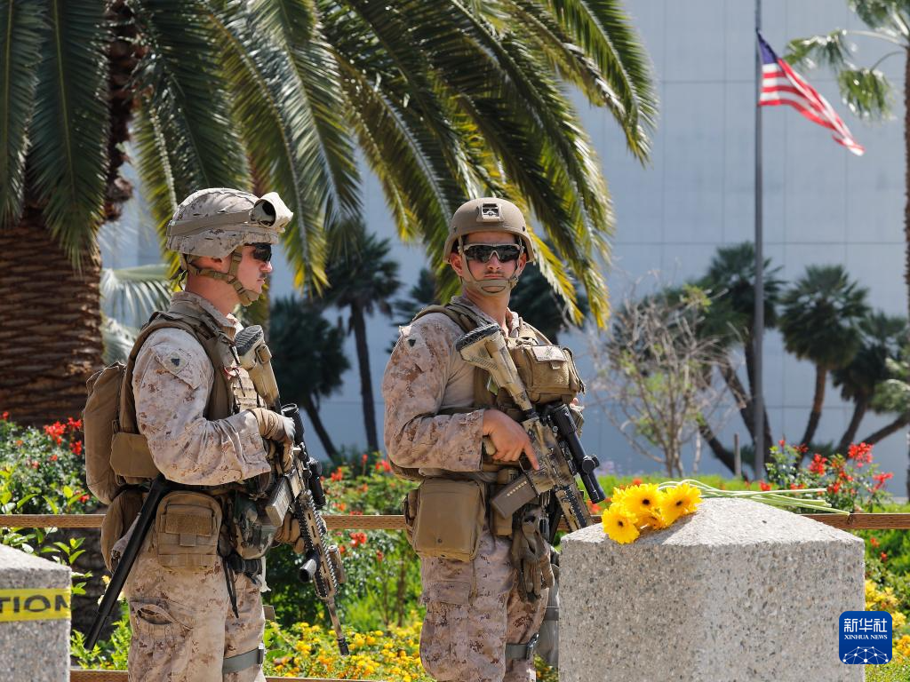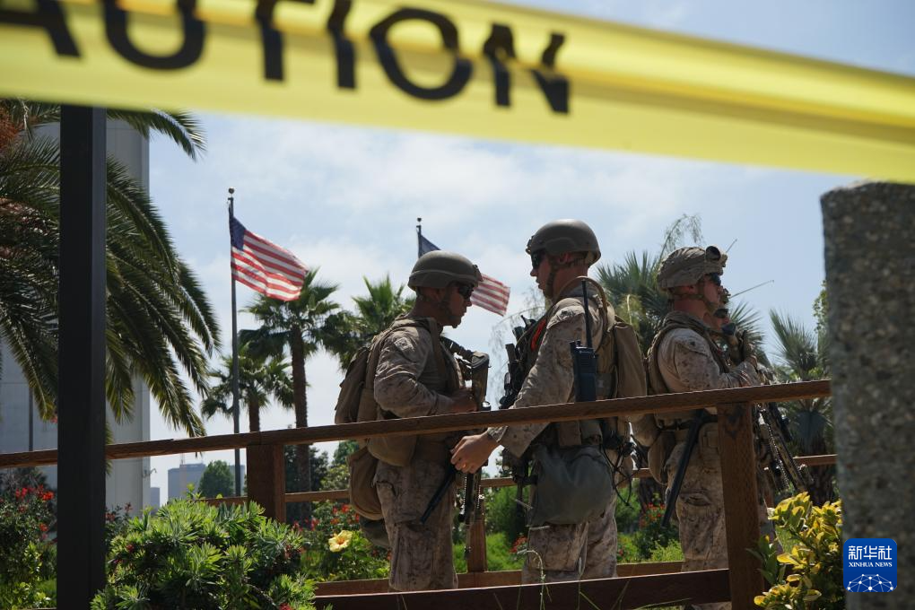 6月13日,美国海军陆战队士兵现身洛杉矶威尔希尔联邦大楼附近。