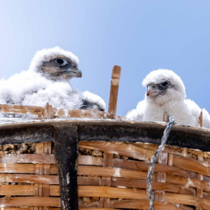 6月7日拍摄的在鹰架巢中栖息的游隼雏鸟。在位于西藏自治区那曲市尼玛县的羌塘国家级自然保护区核心区深处,一座座人工鹰架吸引游隼、大鵟等猛禽停栖、筑巢。