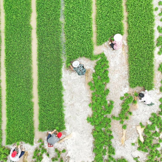6月12日,在江苏省兴化市周庄镇西浒村,农民在田间将刚起的秧苗装车(无人机照片)。