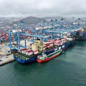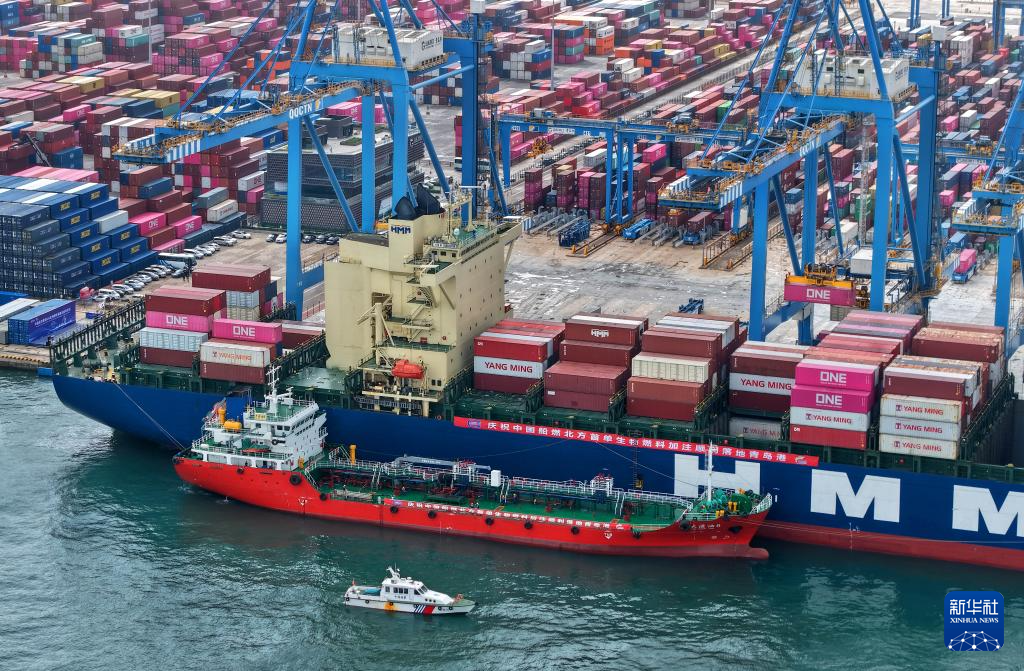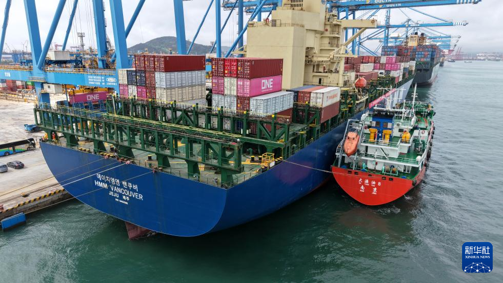 6月14日,山东港口青岛港前湾港区109泊位,“大源油8”轮(中)在为“现代温哥华”轮加注燃料油(无人机照片)。