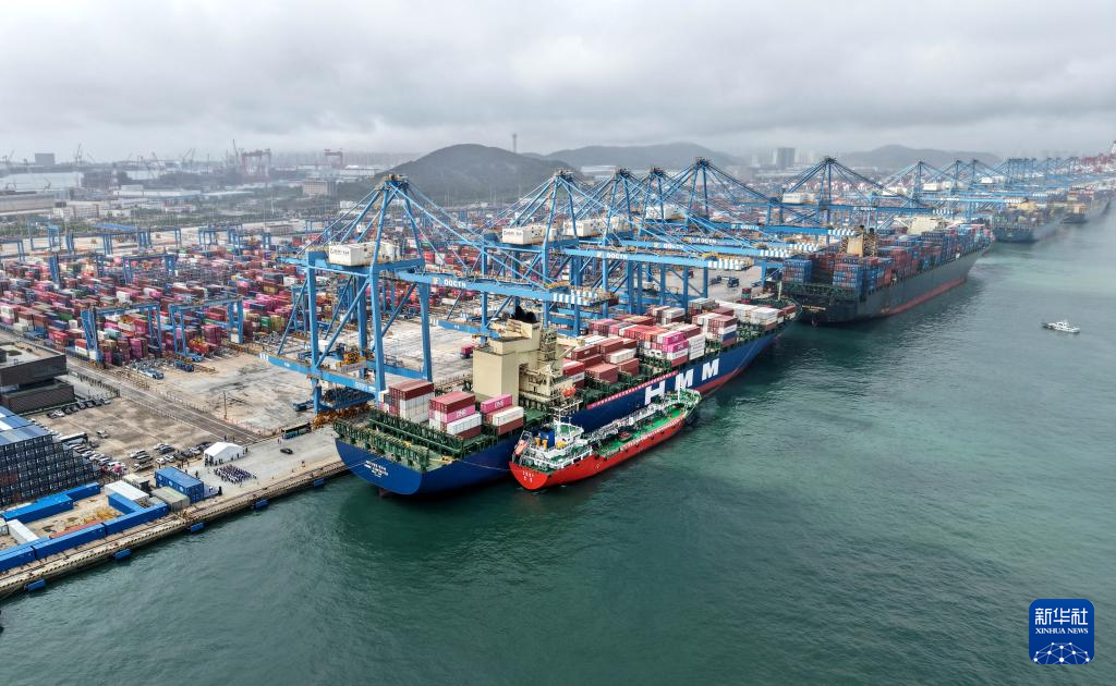 6月14日,山东港口青岛港前湾港区109泊位,“大源油8”轮(右)在为“现代温哥华”轮加注燃料油(无人机照片)。