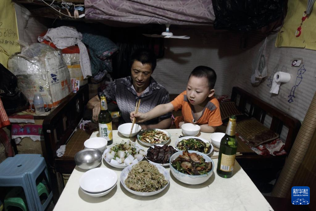 冉光辉和儿子冉俊超在出租房内吃晚饭(2013年5月24日摄)。