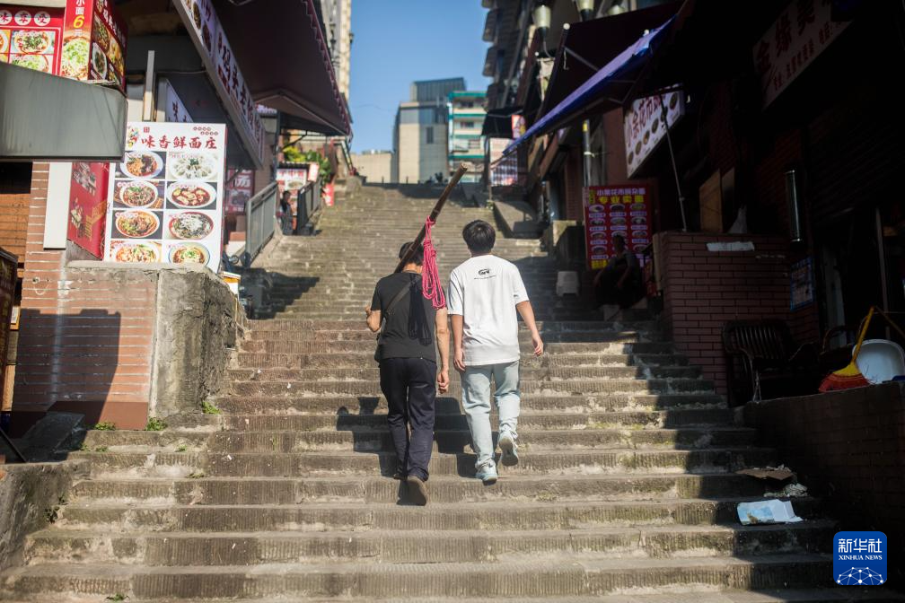 在重庆朝天门批发市场,冉光辉(左)和儿子冉俊超拾级而上(2025年6月14日摄)。