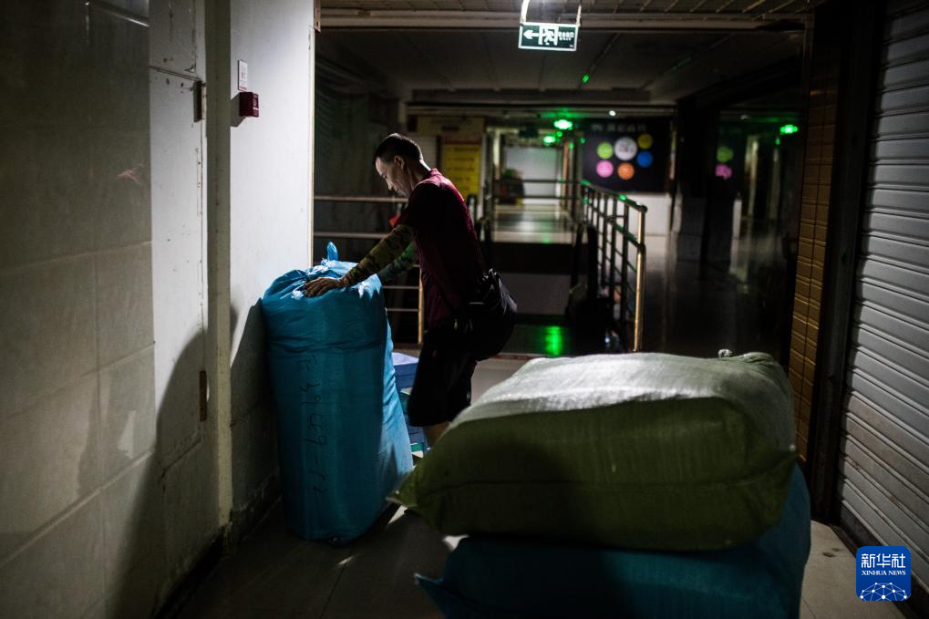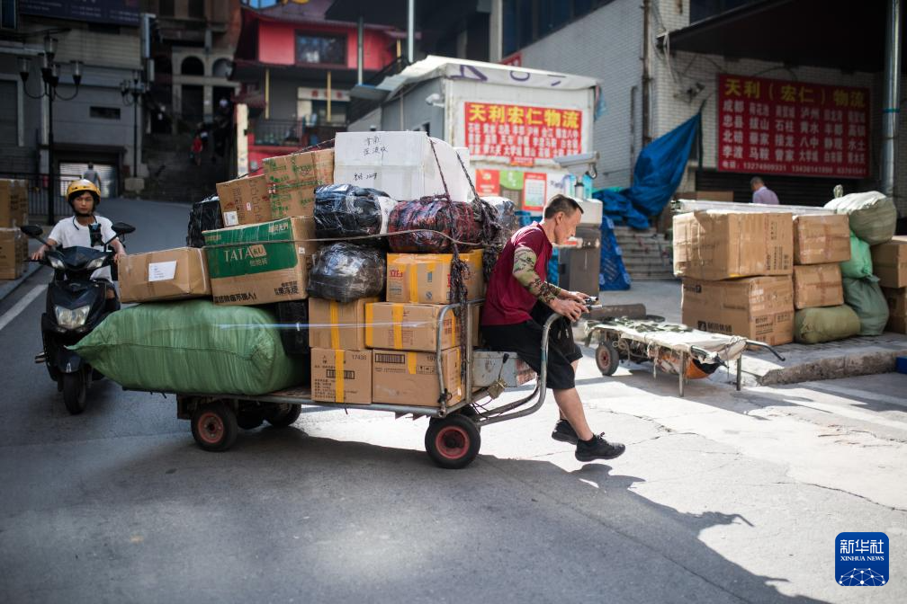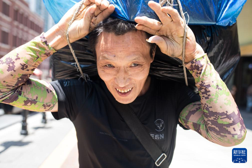 冉光辉在重庆朝天门批发市场搬运货物(2025年6月13日摄)。