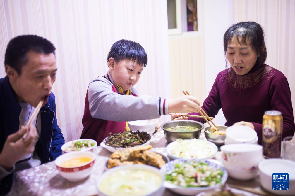 冉光辉一家人在重庆市渝中区的家中吃晚饭(2019年12月20日摄)。