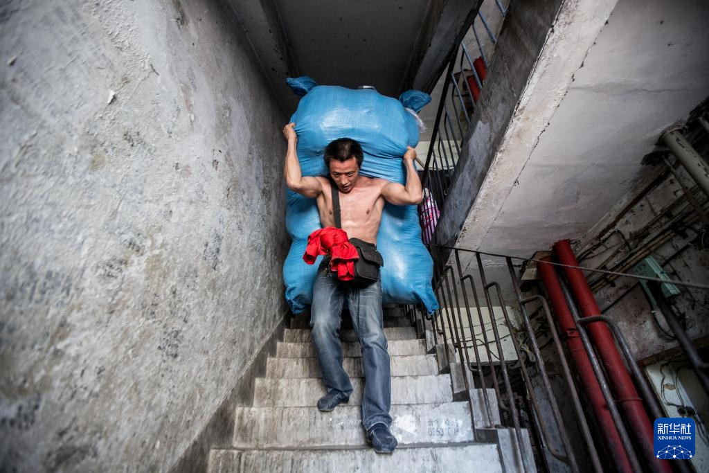 冉光辉扛着两百多斤的货物行走在楼梯间(2015年4月4日摄)。