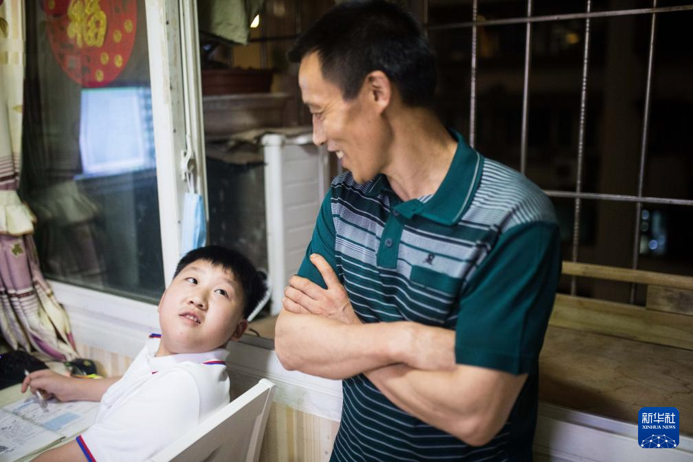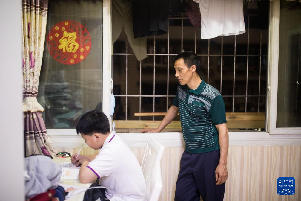 冉光辉在家中默默看着儿子冉俊超写作业(2020年6月9日摄)。