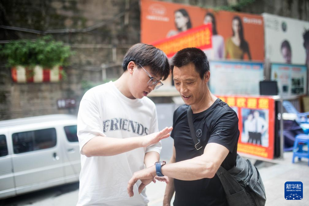 在重庆朝天门批发市场,冉光辉(右)戴上儿子冉俊超送的手表(2025年6月14日摄)。