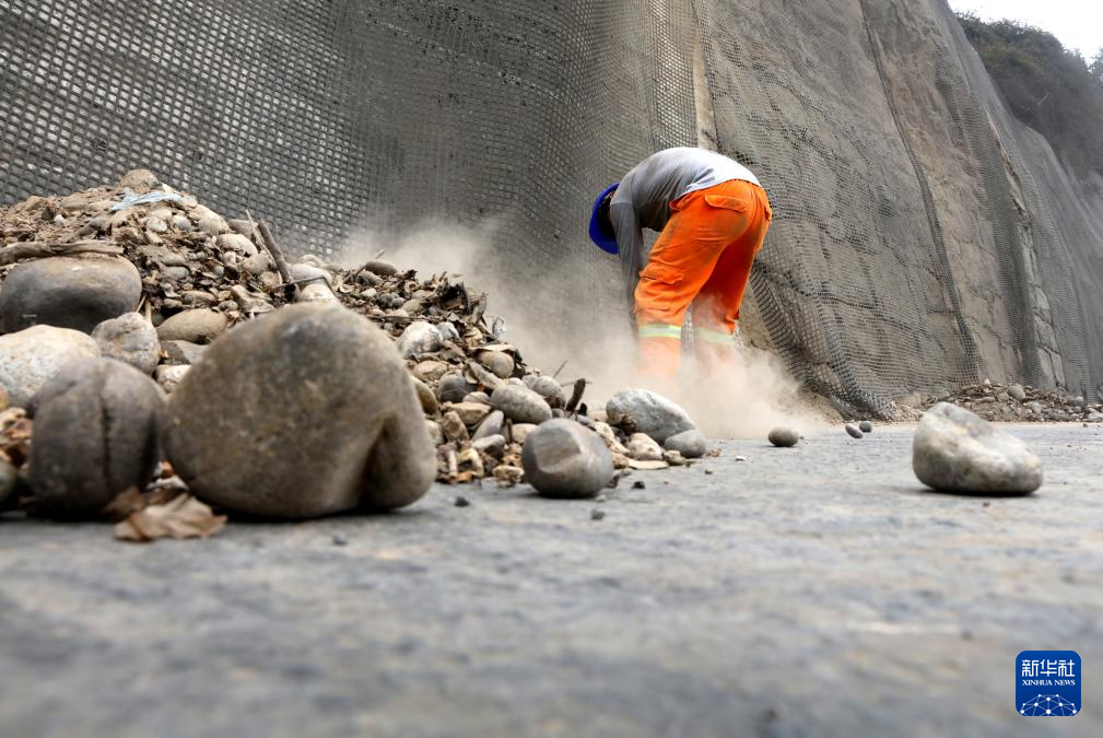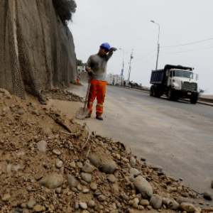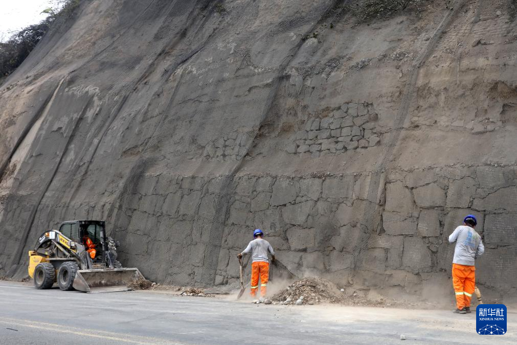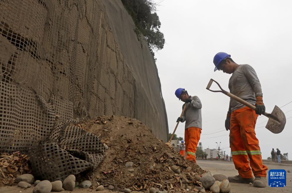 6月15日,在秘鲁首都利马,工人清理利马沿海公路旁受地震影响掉落的碎石。