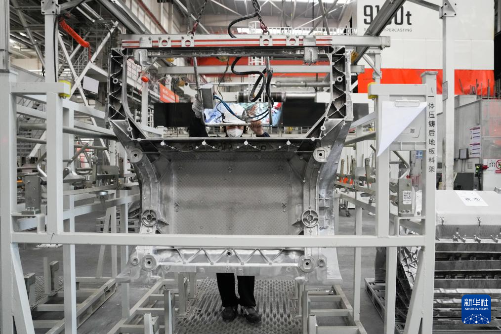 6月16日,机器人在北京小米汽车工厂车间流水线上工作。
