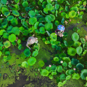 6月18日,武义县柳城镇十里荷花共富工坊的农户在采摘荷花(无人机照片)。