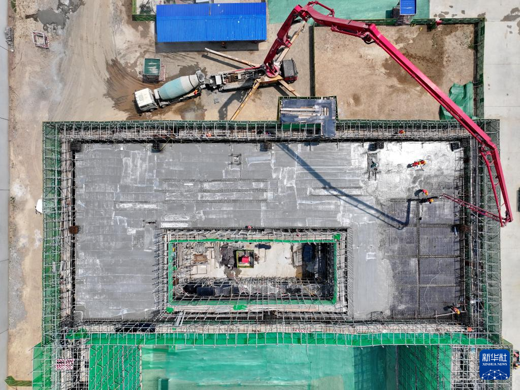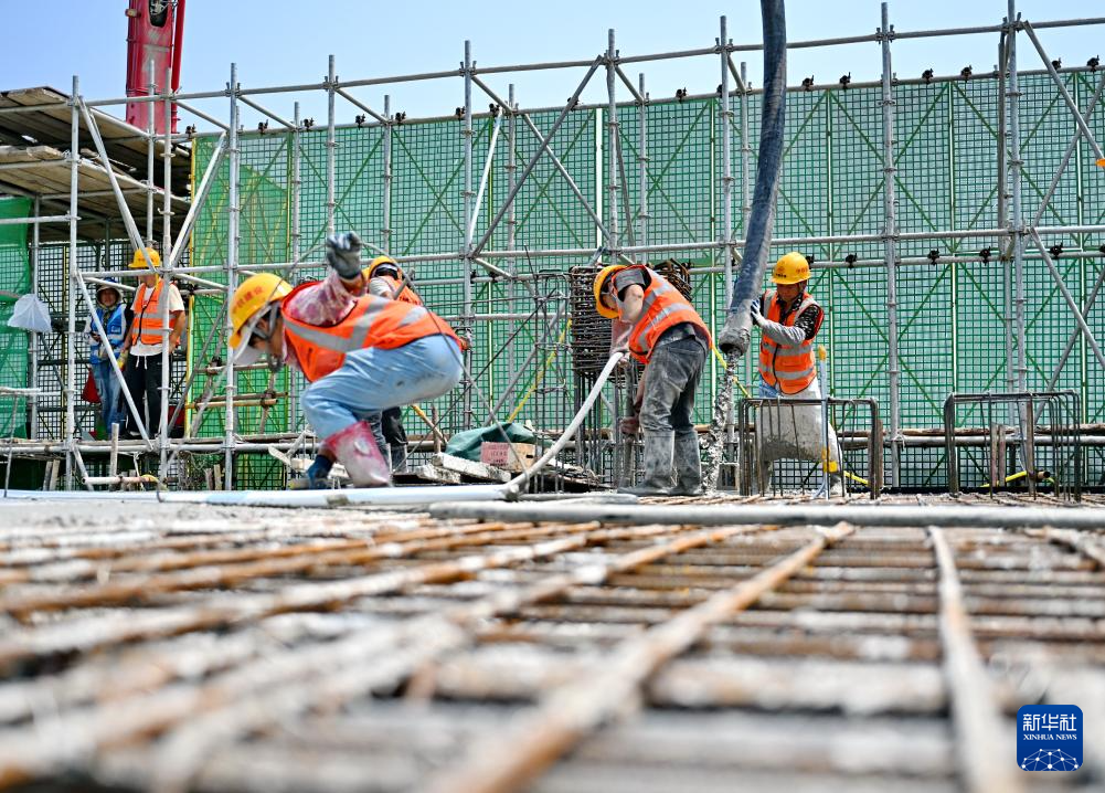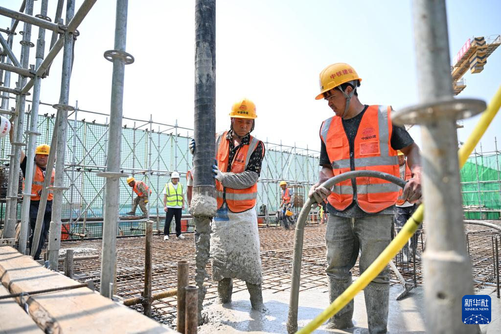 6月18日,中铁建设集团工人在雄忻高铁望都北站建设现场浇筑水泥。