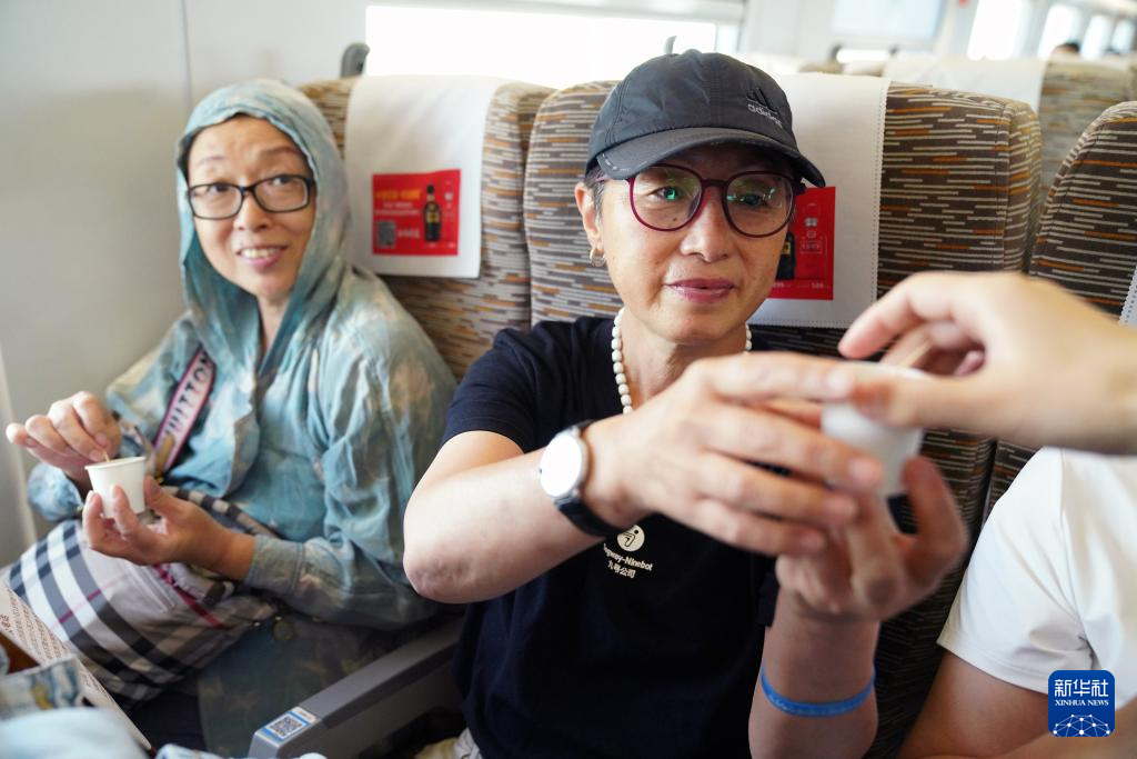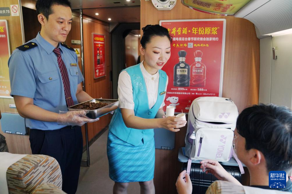 6月18日,乘务人员(左、中)在D6993次动车组列车上为旅客分发齐齐哈尔烤肉。