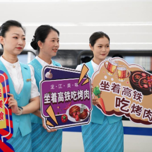 当日,在由哈尔滨西开往齐齐哈尔南的D6993次动车组列车上,中国铁路哈尔滨局集团有限公司联合黑龙江省文旅部门,开展齐齐哈尔烤肉美食文化体验活动。东北特色餐饮产品进入高铁列车,让游客在旅途中打开味蕾,感受齐齐哈尔烤肉独特的风味。