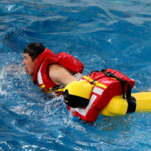 6月19日,在水上求生(海洋组)竞赛现场,一名参赛者拖带假人(被救者)游泳。