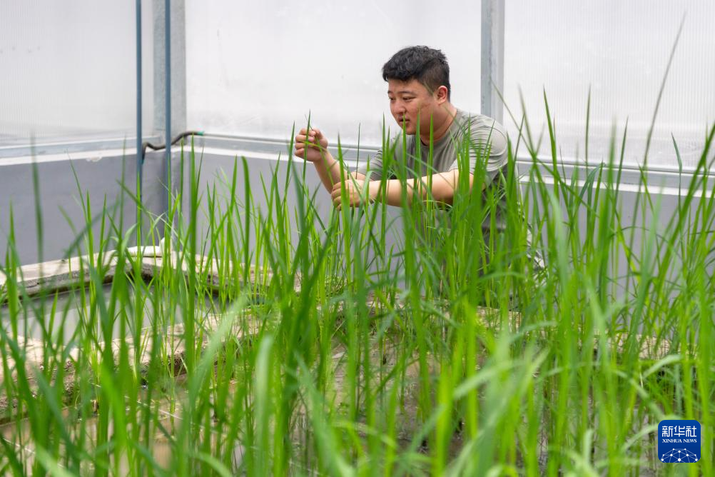 6月18日,在中国水稻研究所北方水稻研究中心的玻璃温室中,科研人员查看杂交水稻亲本的长势。