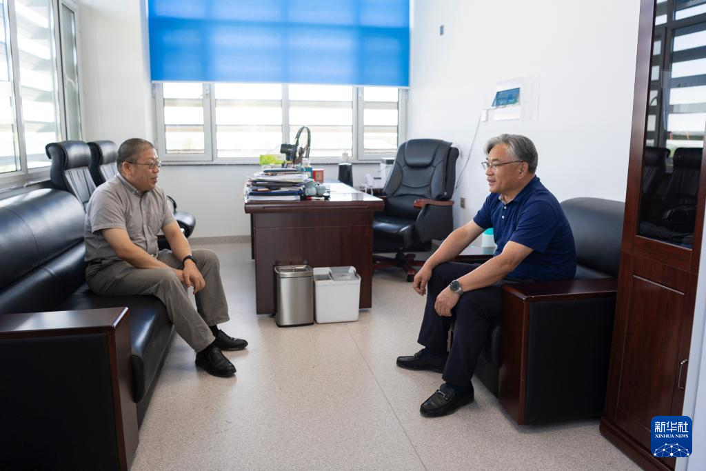 6月18日,在中国水稻研究所北方水稻研究中心,中心主任曹立勇(右)与浙江大学农业与生物技术学院教授徐海明交流寒地粳稻智能育种方面的合作。