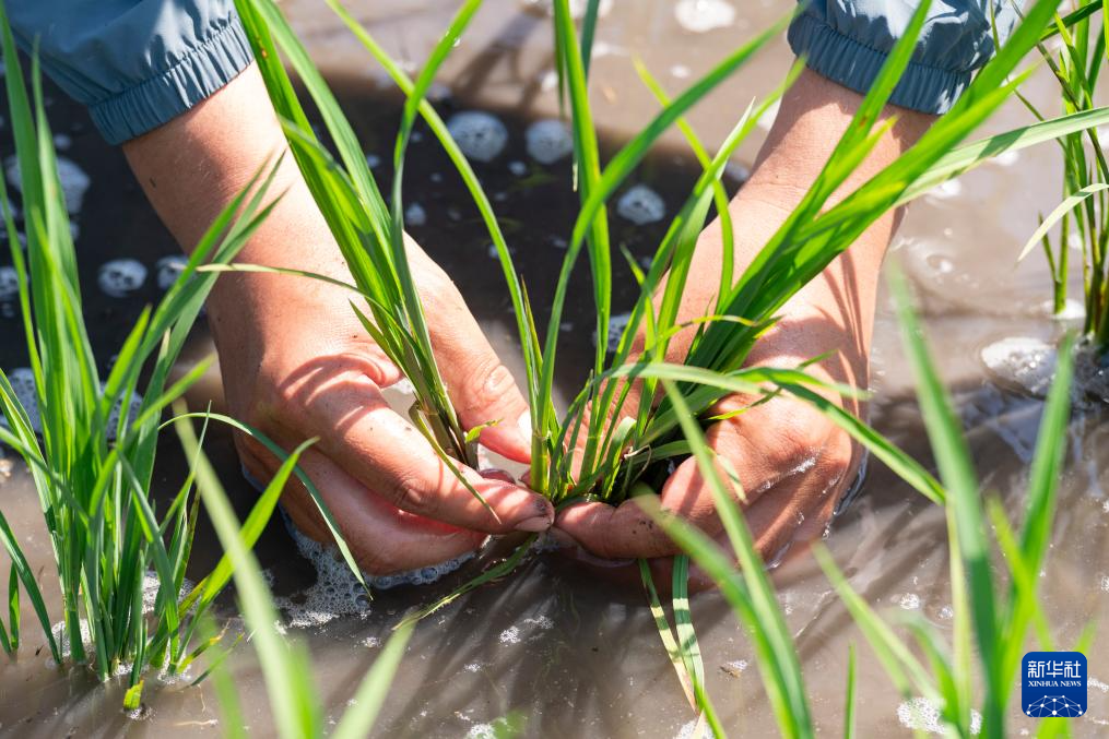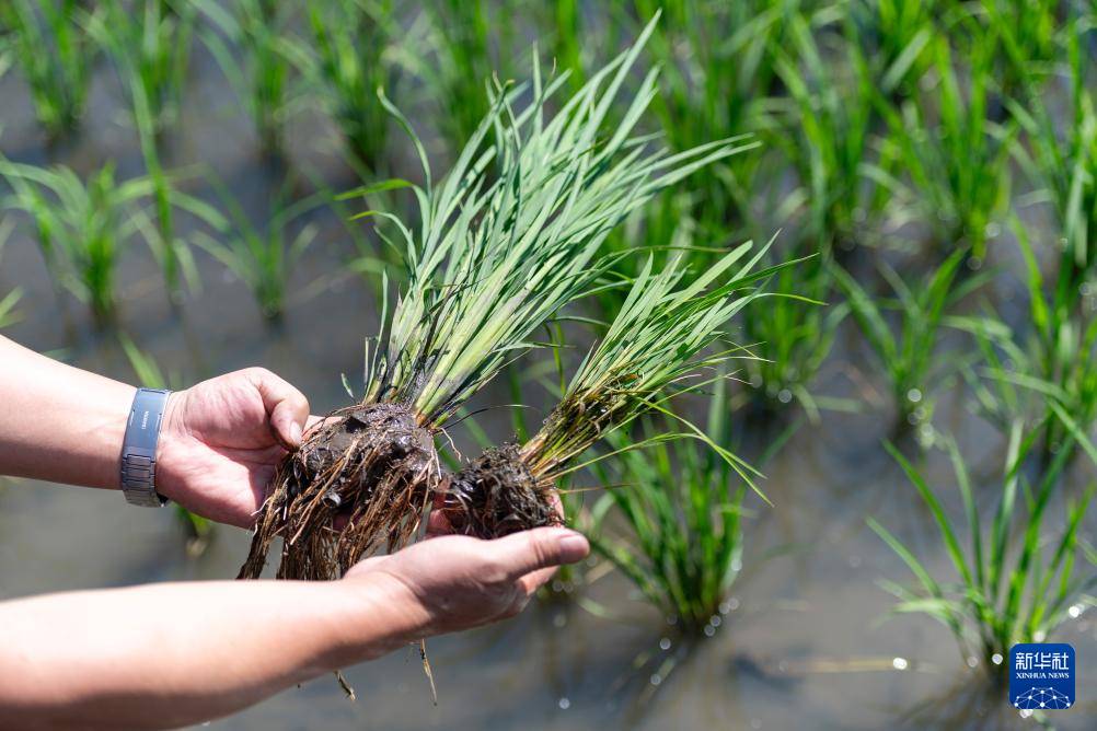6月18日,在中国水稻研究所北方水稻研究中心的试验田内,科研人员查看水稻根系生长情况。