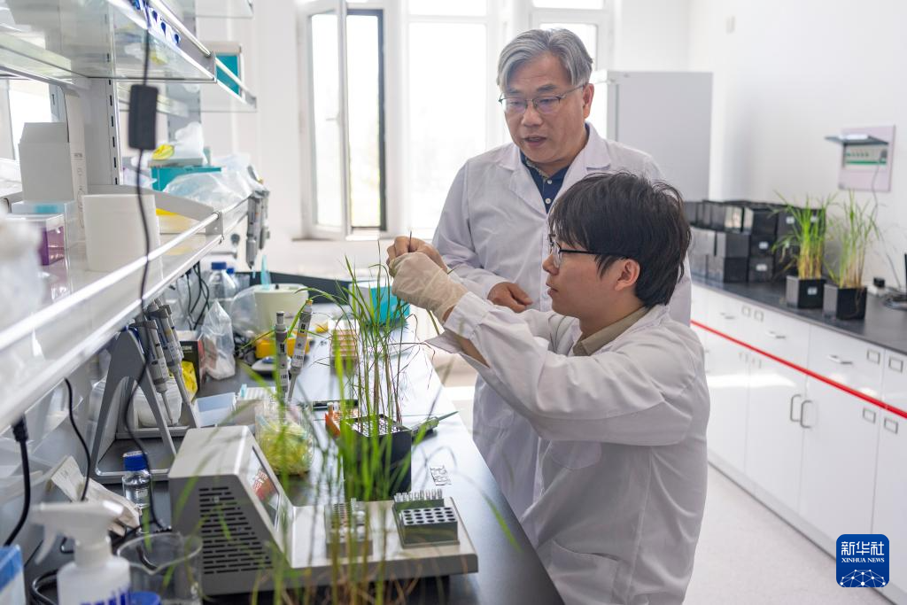 6月18日,在中国水稻研究所北方水稻研究中心,中心主任、研究员曹立勇(后)指导科研人员测试水稻对不同化合物的反应。