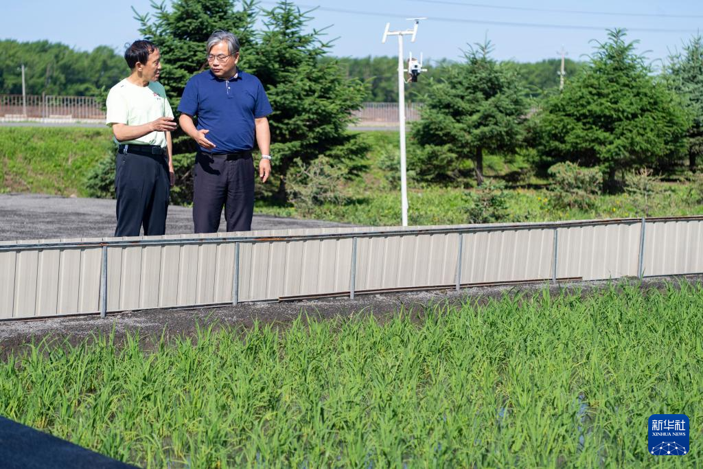 6月18日,在宝清县一片水稻田旁,中国水稻研究所北方水稻研究中心科研人员查看应用寒地水稻秸秆全量原位还田缓释多效综合技术的水稻(左)与普通水稻的长势差别。该技术能够有效减少化肥用量、提升土壤有机质含量,让农户在节约成本的同时提产增效。