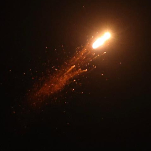 6月19日凌晨,在以色列特拉维夫,防空系统发射拦截弹留下光亮的轨迹(画面右侧)。