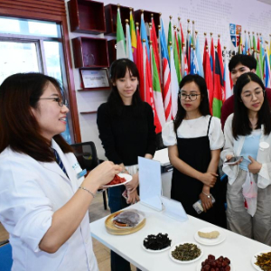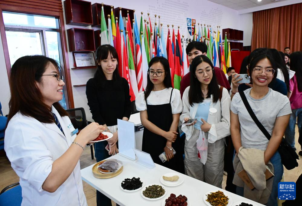 6月20日,青岛西海岸新区中医医院中药师何广云(左一)向国际学生讲解各种中草药的药效。