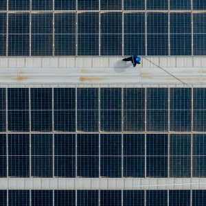 6月20日,宁夏同心县河西镇菊花台村,建设单位工作人员对分布式光伏板进行巡检(无人机照片)。