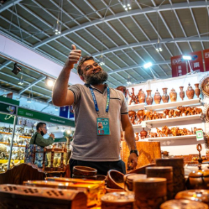 6月21日,一名南亚馆巴基斯坦展区的展商在摆放木制手工艺品。