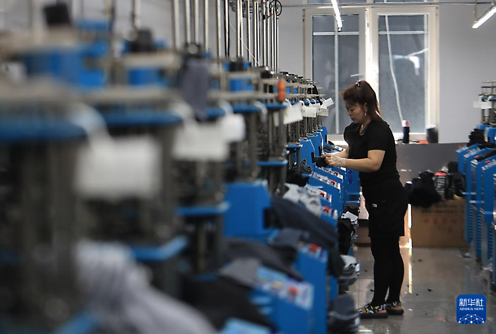 2025年6月20日,在辽阳县兴隆针织厂,工人在车间生产袜子。