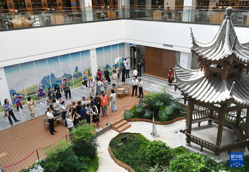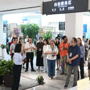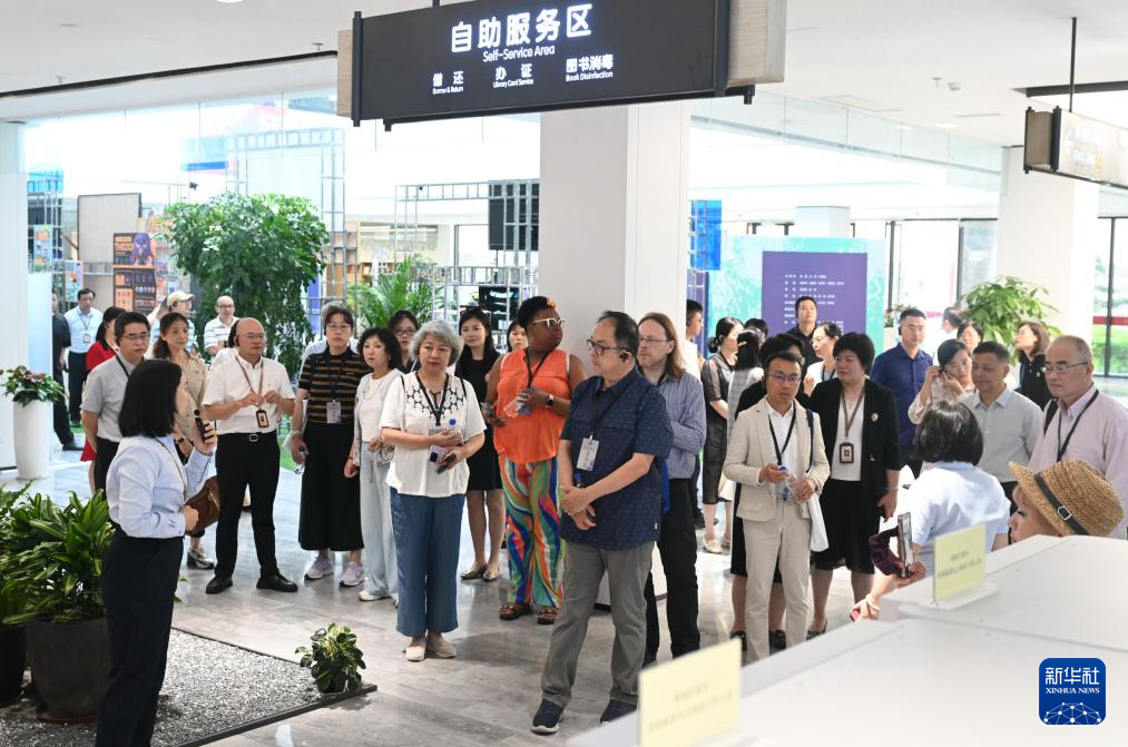 6月21日,中外图书馆员在福建省图书馆自助服务区域参观。