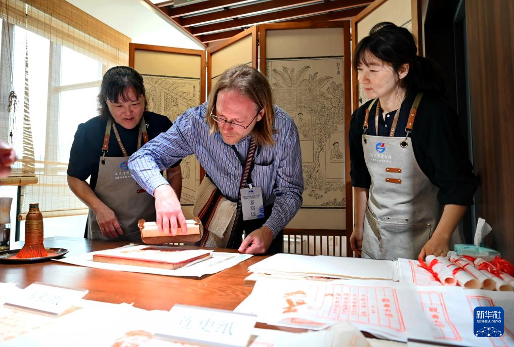 6月21日,外国嘉宾在福建省图书馆“八闽书房”体验雕版印刷。