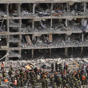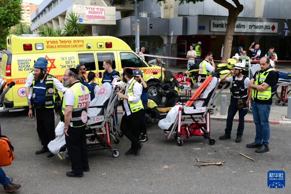 6月22日,在以色列中部特拉维夫的导弹袭击现场,应急和救援人员开展工作。
