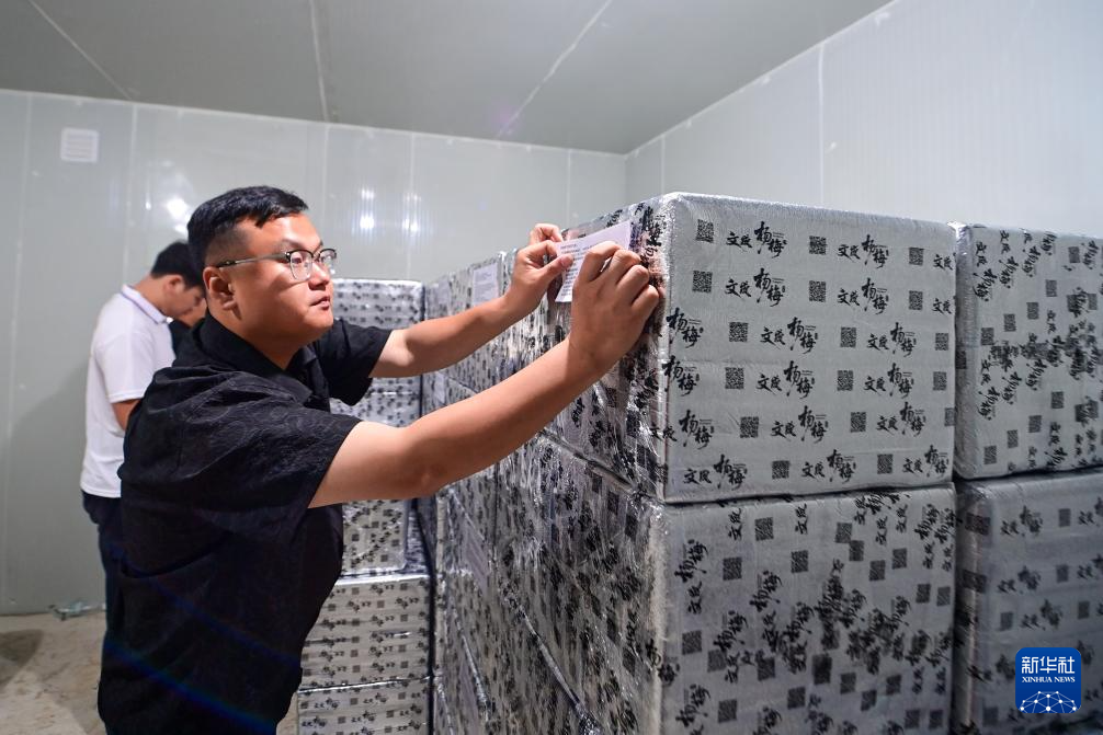 6月23日,在浙江省温州市文成县环飞云湖杨梅基地,工作人员在冷库清点东魁杨梅。